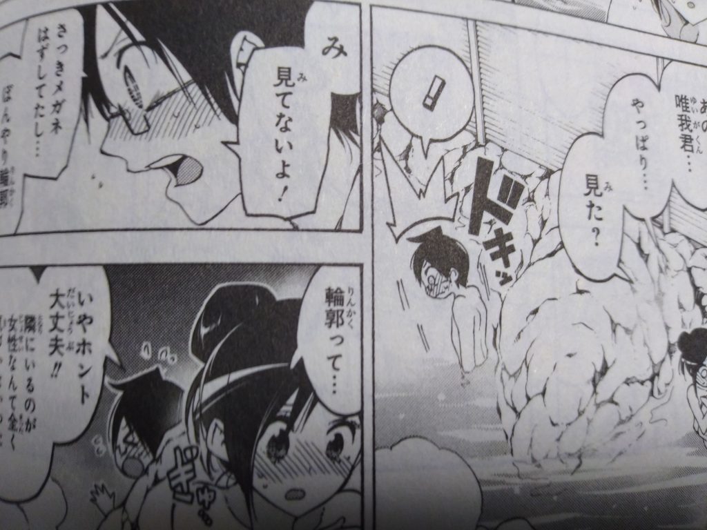 そして!後から入ってきた、成幸に、注意された文乃・理珠・うるかは、他の男子達が来る前に、颯爽と退出するのですが、文乃は、とある出来事で、成幸に、身体を見られたと、思ったのが、気になったので、退出する前に、一応確認で、『あの…唯我君…やっぱり…見た?』と聞いてみると、彼は、『見てないよ!さっき眼鏡はずしてたし…ぼんやり輪郭くらいしか…』と言い、文乃は、頬を赤くして、慌てて胸を、隠します。