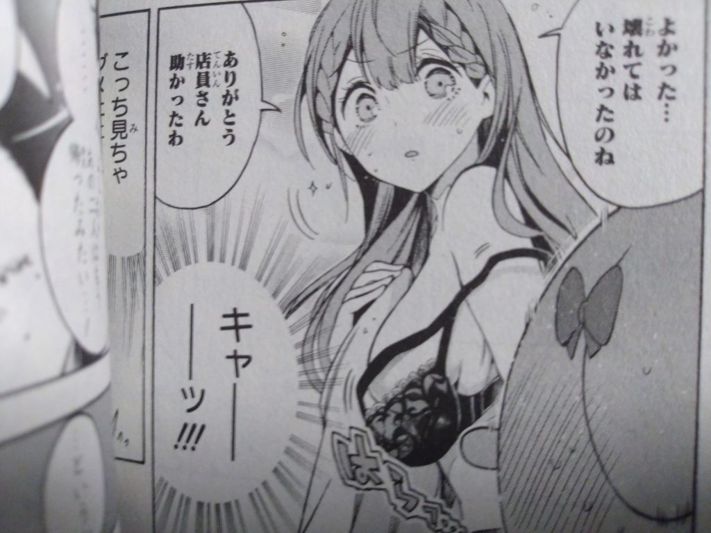 そして『よかった…壊れてはいなかったのね ありがとう店員さん 助かったわ』と振り向き桐須先生はお礼を言うですが!ブラが落ちてしまい『こっち見ちゃダメェェー!!』と心の中で叫ぶ成幸なのでした。