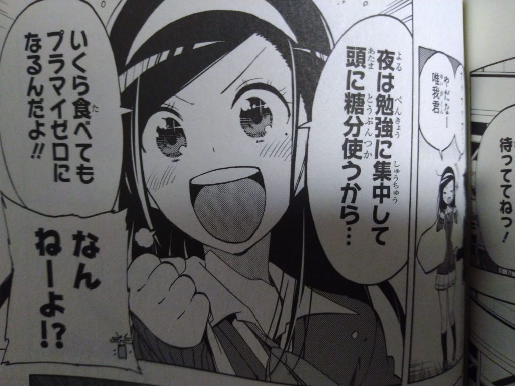 夜食を買いにスーパーに寄って帰るのですが、出てきた時に持っていた袋には!!!食べ物がパンパンで全然ダイエットをする気が見えなく、そして!その時言った文乃の台詞が『夜は勉強に集中して頭に糖分を使うから…いくら食べてもプラマイゼロになるんだよ!!』です。