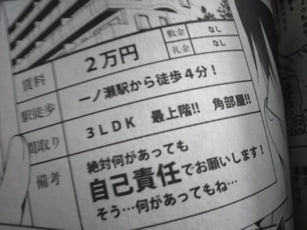 そこには、賃料2万円・敷金なし・礼金なし・駅徒歩 一ノ瀬駅から徒歩4分!・間取り 3LDk 最上階!! 角部屋!! 備考: 絶対何があっても、自己責任でお願いします!そう…何があってもね…と書いてあり、(怪しい)と思う成幸を よそにドヤ顔の真冬先生は、『じゃあ私は、行くから勉強しっかりね 唯我君』と言い去って行くのを止め、一緒に着いていく成幸なのでした。