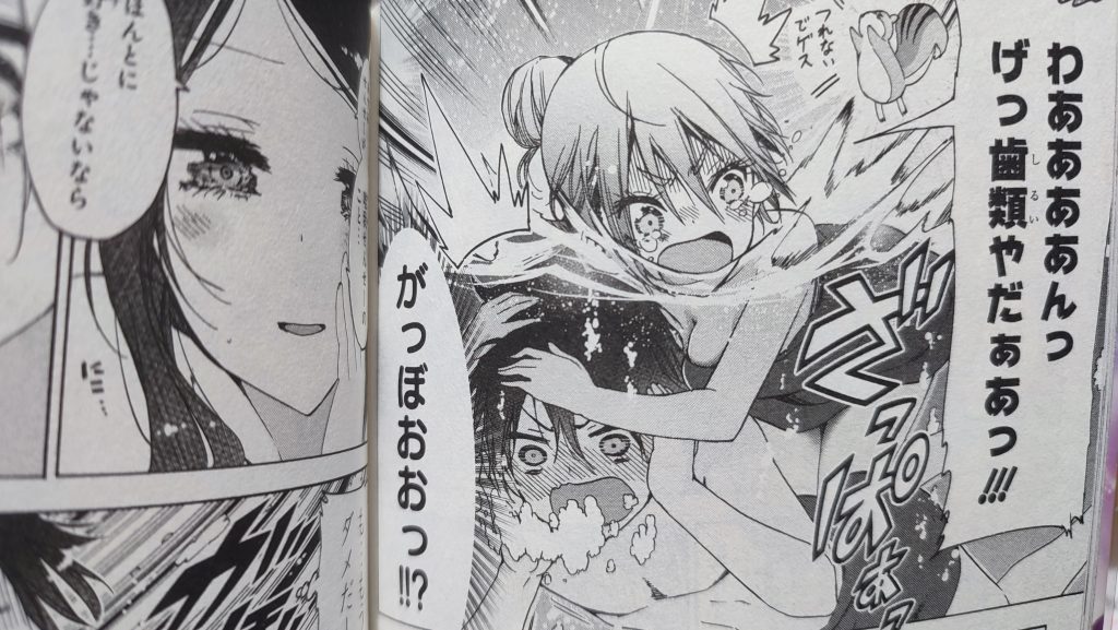 そして女性陣の中に、小美浪あすみがいたので、成幸が見つからないように、湯の中に隠してくれるのですが、あすみの大嫌いなげっ歯類に遭遇していまい!!!!成幸に抱きついてしまいます。