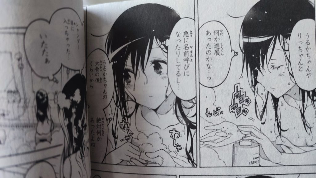 このシーンは、温泉で、古橋文乃が『唯我君…うるかちゃんやりっちゃんと、何か進展あったかな…?急に、名前呼びに、なったりしてるし…うるかちゃんの大会の後くらいから、絶対何かあったよね…』と体を洗いながら、三人の進展を気にしている場面です。