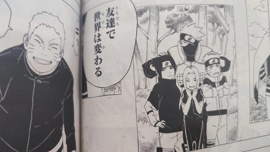 啞然とする彼に、『ケンカすんなら、相手がいた方がいい、それだけの、価値のあるライバルがな』とナルトは言いながら、カワキと一緒に、壁に貼ってある、カカシ班の写真を見て『友達で、世界は変わる』と言うのですが、疑心暗鬼なカワキは、『どうだかな…』と言い、イマイチ納得してなさそうな彼に、ナルトは、笑顔で、それも経験済みだと言うのでした。