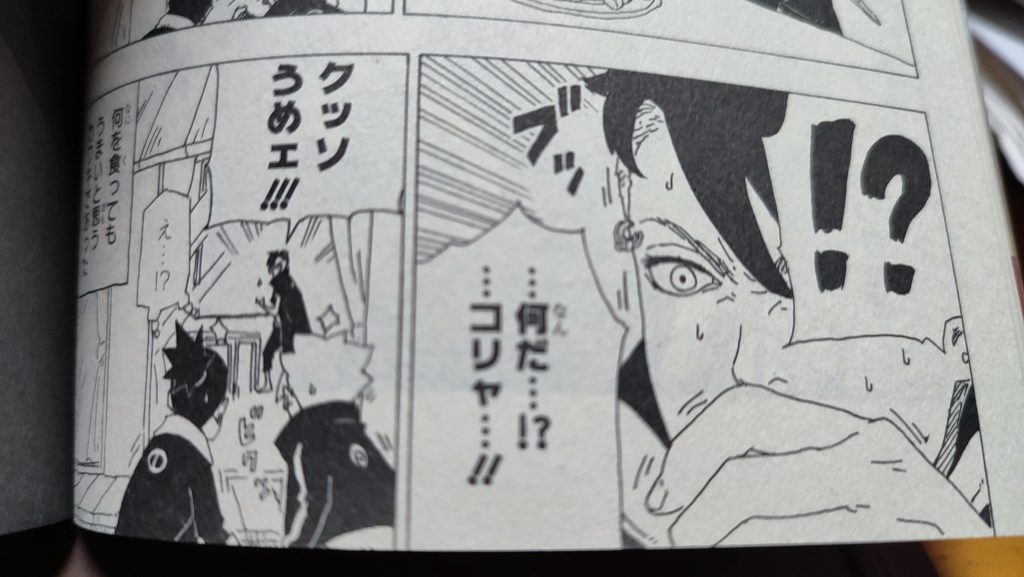 このシーンは、シカダイとボルトが悪戯で、たい焼きの中身を、大量のワサビに入れ替え、カワキに食わせるのですが!!!大量のワサビが入った!たい焼きを、食った彼のリアクションは、慌てて水を飲む訳ではなく、『クッソうめェ!!!』と、喜んでしまうのでした。