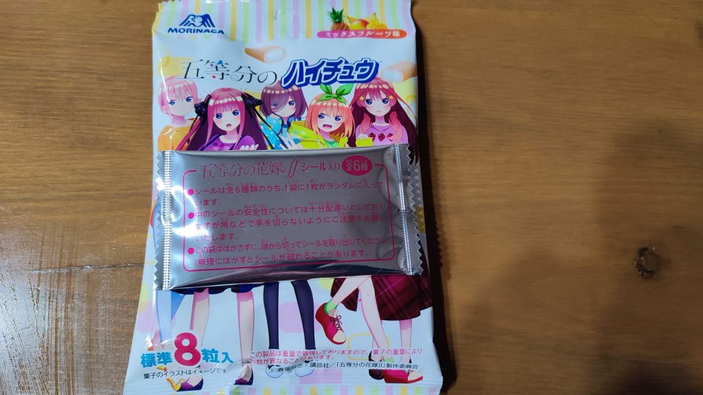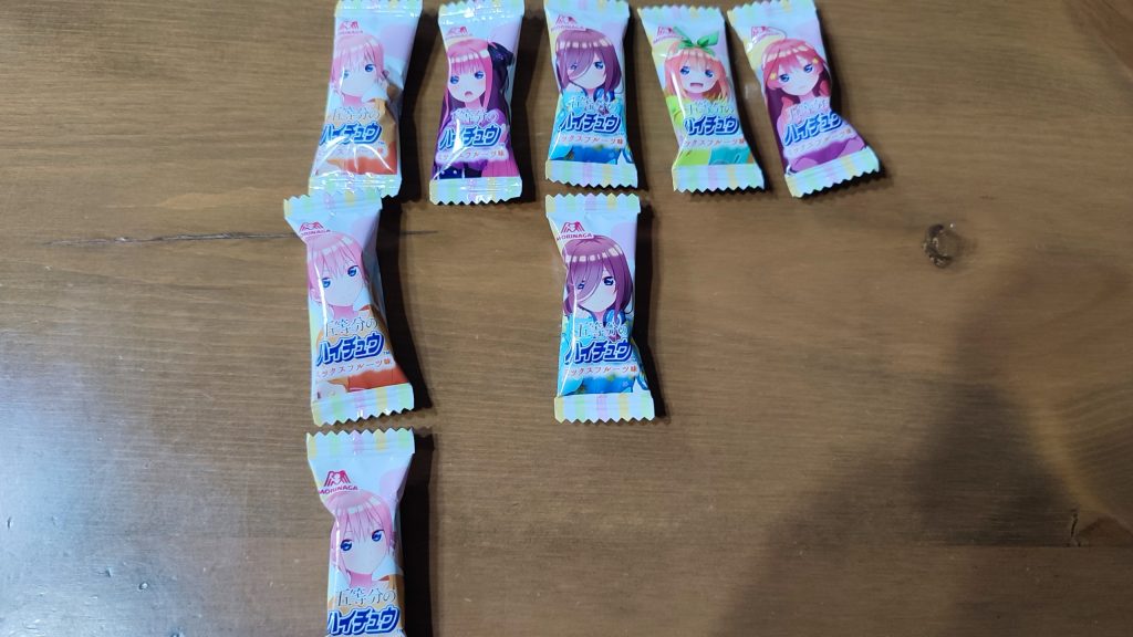 個包装も、五等分の花嫁デザインに、なっており、中野一花・中野二乃・中野三玖・中野四葉・中野五月とデザインされており、自分の、持っているハイチュウには、全キャラいるのですが!!!袋の裏に、5種類が全部入っているわけでは、ありませんと書いてあるので、もしかすると!!!!ほかのハイチュウには、全キャラの個包装が無く、ダブリが多いので、ショックの多い人が、いるのだろうなぁーと思うのでした。