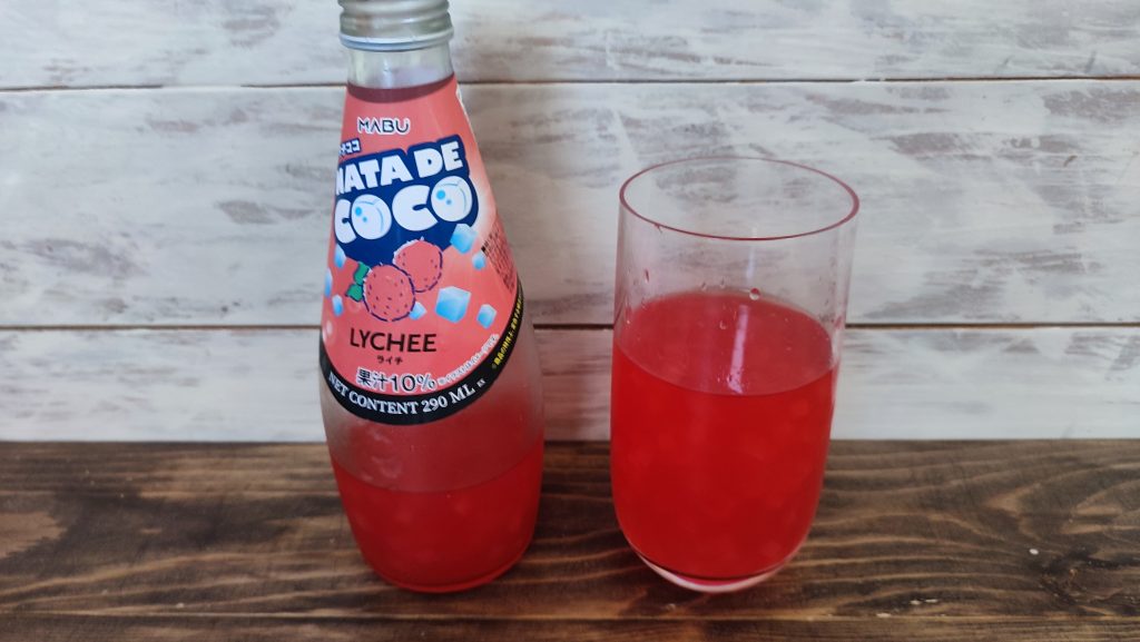 真っ赤で見にくいと思いますが、中に大量のナタデココが入っており、つぶつぶ感が味わえるのと、強烈なライチの味があるので、かなり美味しい感じがするとotaku-dxは思うのですが、ライチ・ナタデココ嫌いな人には、あまりオススメできません😞