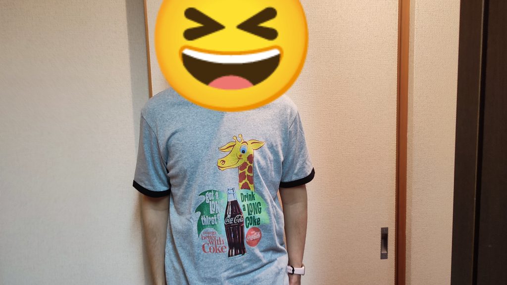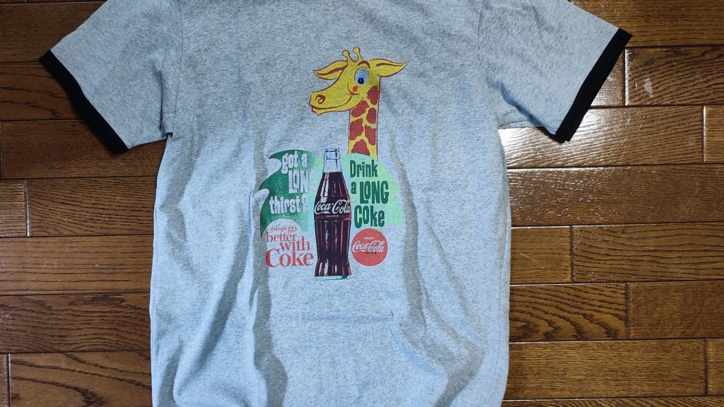 可愛いらしいキリンと、コカ・コーラが描かれたTシャツで、目に止まり気に入ったので、即購入しました。