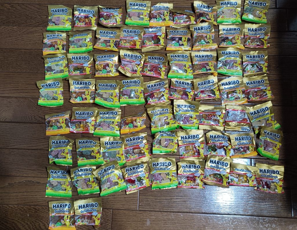 バケツの中の、ハリボーの小袋を、全部出して、並べてみると、65個入っていました。