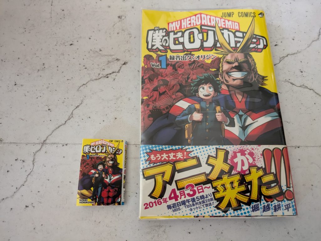 私が持っている、僕のヒーローアカデミア1巻と比べてみると、表紙がめっちゃそっくりだし、これは、ヒロアカ好きだと、興奮してしまう一品と、思うotaku-dxなのでした。