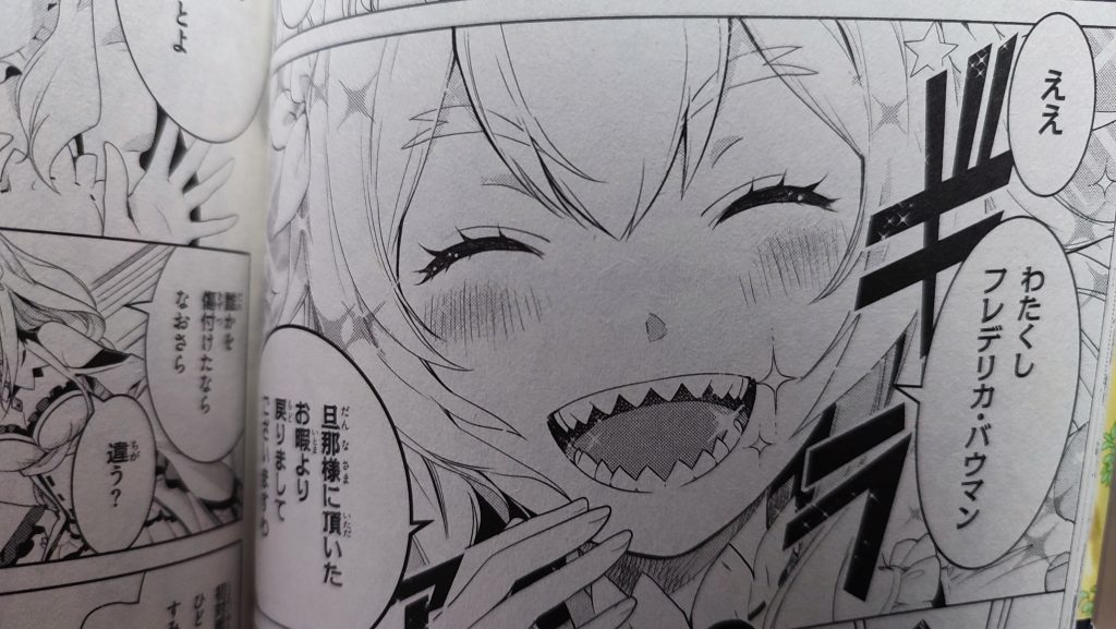 このシーンは、とある出来事により、ロズワール邸に戻る事になった、スバルとエミリアは、そこで、金髪の美女のメイドに、出迎えられ、スバルは、誰か分からずにいると、エミリアは『フレデリカ?』と、自信なさげに、尋ねると、メイドは『ええ、わたしくし、フレデリカ・バウマン、旦那様に頂いたお暇より、戻りまして、ございますわ』と、にこやかに、応えるのですが!!!笑った時に、見えた鋭い歯に、スバルは怖がってしまう上に、『顔怖ーッ!!』と声に出してしまった為、エミリアに、注意されてしまうのでした。