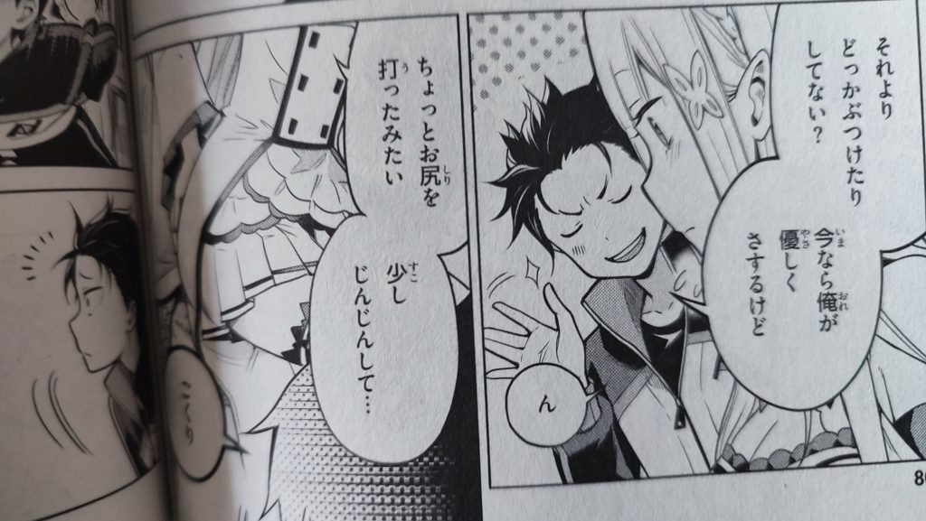 このシーンは、とある出来事により、聖域での試練に、失敗したエミリアを気遣って、スバルは『どっかぶつけたり、してない?、今なら、俺が優しくさするけど』と声を掛け、彼女は、『ちょっとお尻を、打ったみたい、少し、じんじんして…』と尻を擦るので、スバルは、思わず唾を、飲み込み!擦ろうとした瞬間!!!ラムに制止されるのでした。